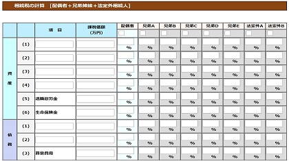■配偶者、子供等、直系親族、兄弟姉妹等の相続人、にチェックを入れ、各法定相続割合を計算し、遺産総額より基礎控除額、